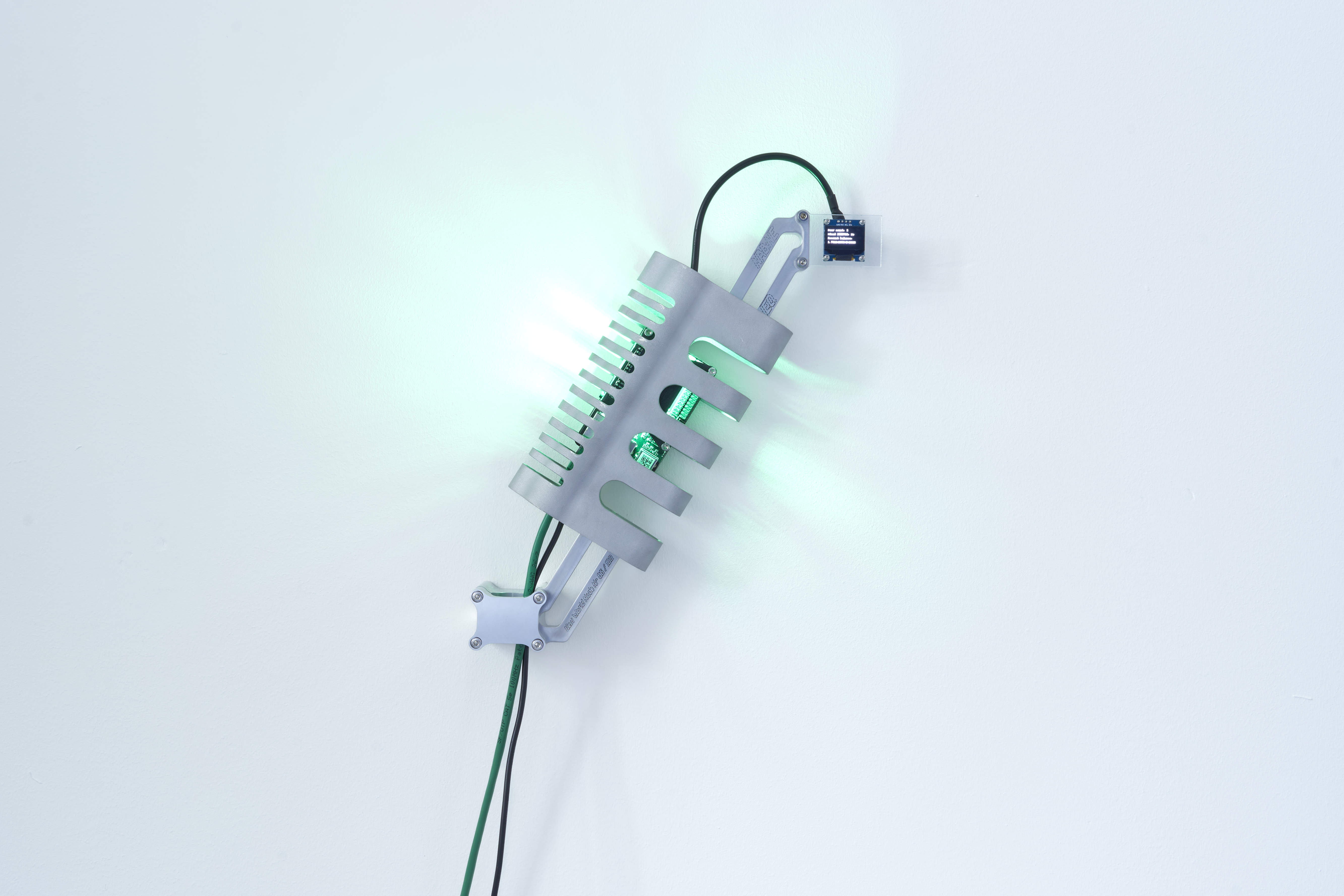 Niko Abramidis &NE, New World Node, 3d printed aluminum, ARM-chip, LCD-display, ethernet cable, LEDs, 33 x 27 x 6 cm, 2023