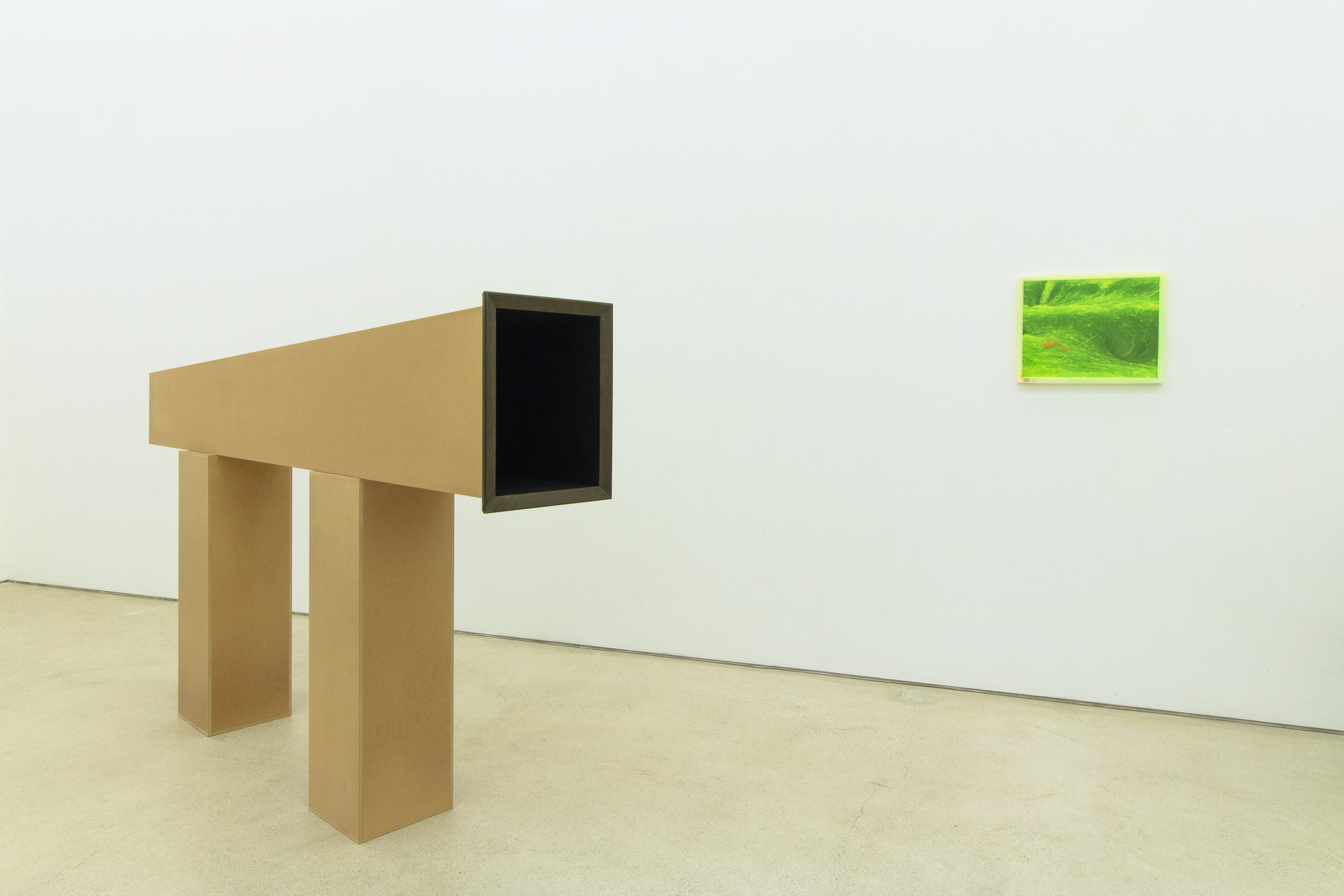 Andy Hope 1930, Time Tube 11, MDF, acrylic, vintage picture frame, 156 x 46 x 253 cm, 2011 (courtesy Galerie Guido W. Baudach) and Susi Gelb, reality is a fake 033, pigment print, polyurethane artist frame, pigments, sand, plexiglass, museums glass, 42,5 x 52,5 x 3 cm, 2025 (courtesy Nir Altman)